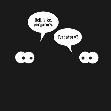 In Chapter 2 there’s some discussion about Hell, which I had quite a bit of fun writing. At the time I was writing it I wasn’t thinking about the classic cartoon The Far Side, but apparently, Gary Larson left his mark on my subconscious when it comes to how I perceive the concept of Hell.